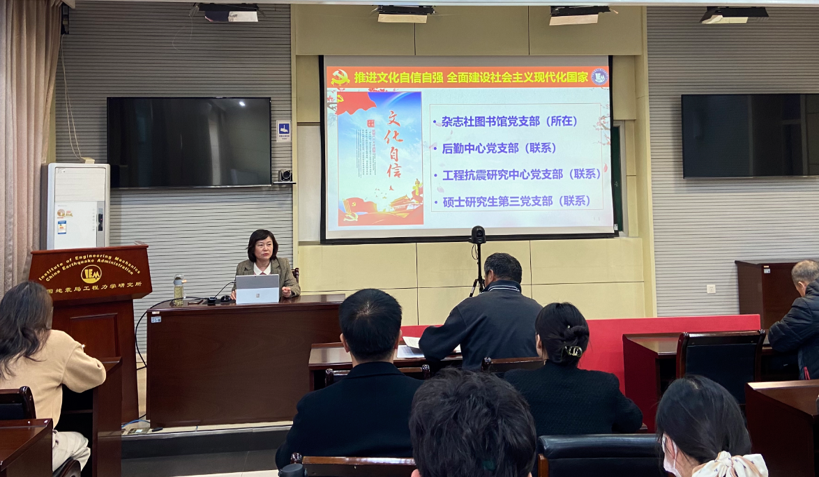 3月21日,黨委委員、副所長張令心同志以“推進文化自信自強,全面建設社會主義現代化國家”為題,為雜志社圖書館黨支部、后勤中心黨支部、工程抗震研究中心黨支部、碩士研究生第三黨支部宣講黨的二十大精神。