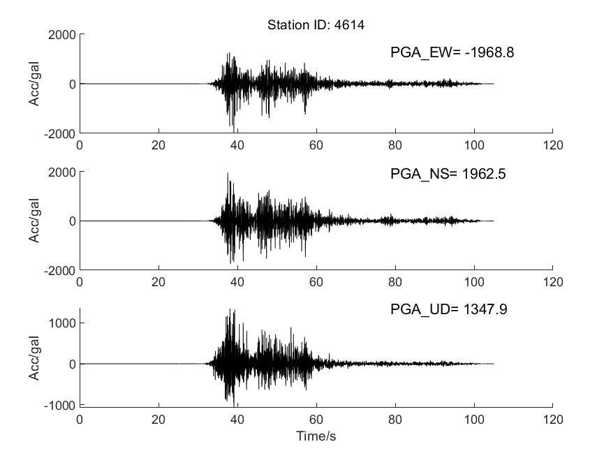 地震后強震動觀測中心收集獲取了距震中483公里范圍內(nèi)強震動記錄263組,并迅速組織人員進(jìn)行處理。獲取記錄臺站加速度記錄分析結(jié)果見表1(節(jié)選部分),其中4614臺PGA峰值最大,其震中距為42.4km,東西、南北、垂直向加速度峰值分別為-1968.8cm/s2、1962.5cm/ s2、1347.9cm/ s2,東西、南北、垂直向速度峰值分別為-51.3cm/s、66.8cm/s、-28.5cm/s,計算儀器地震烈度9.5度。