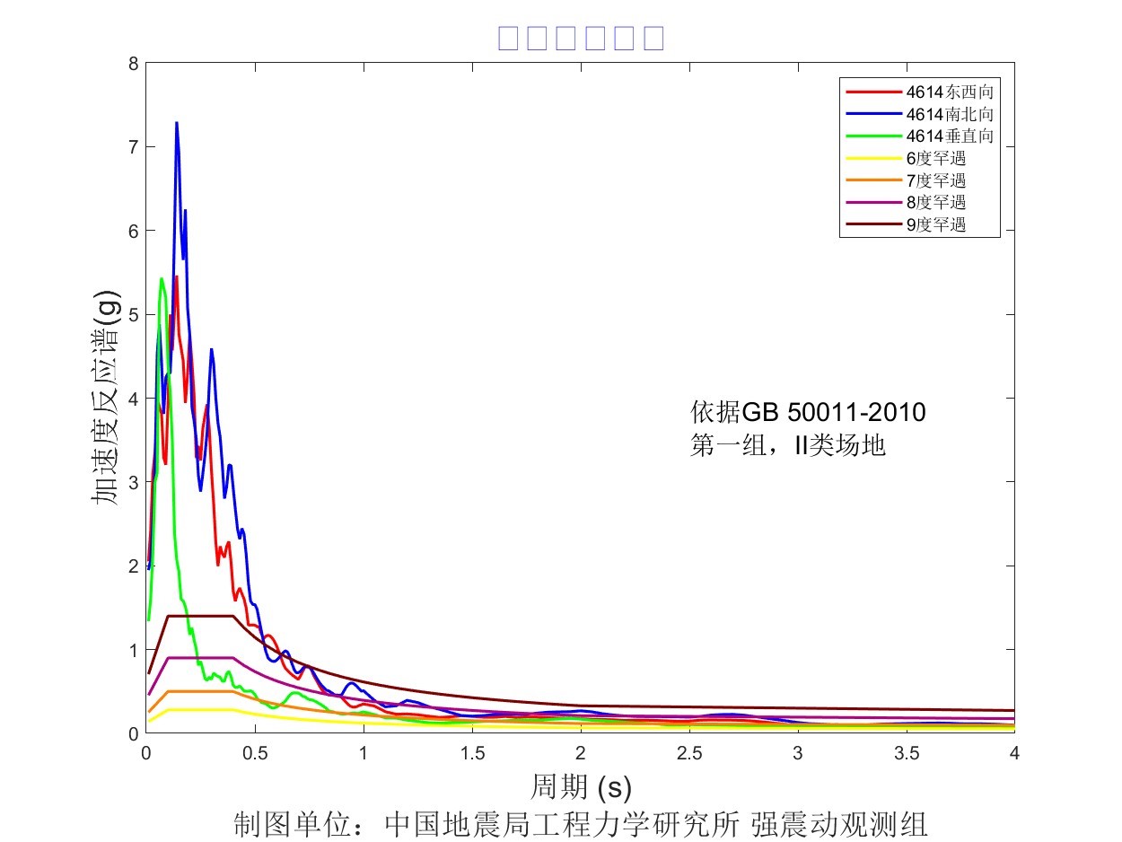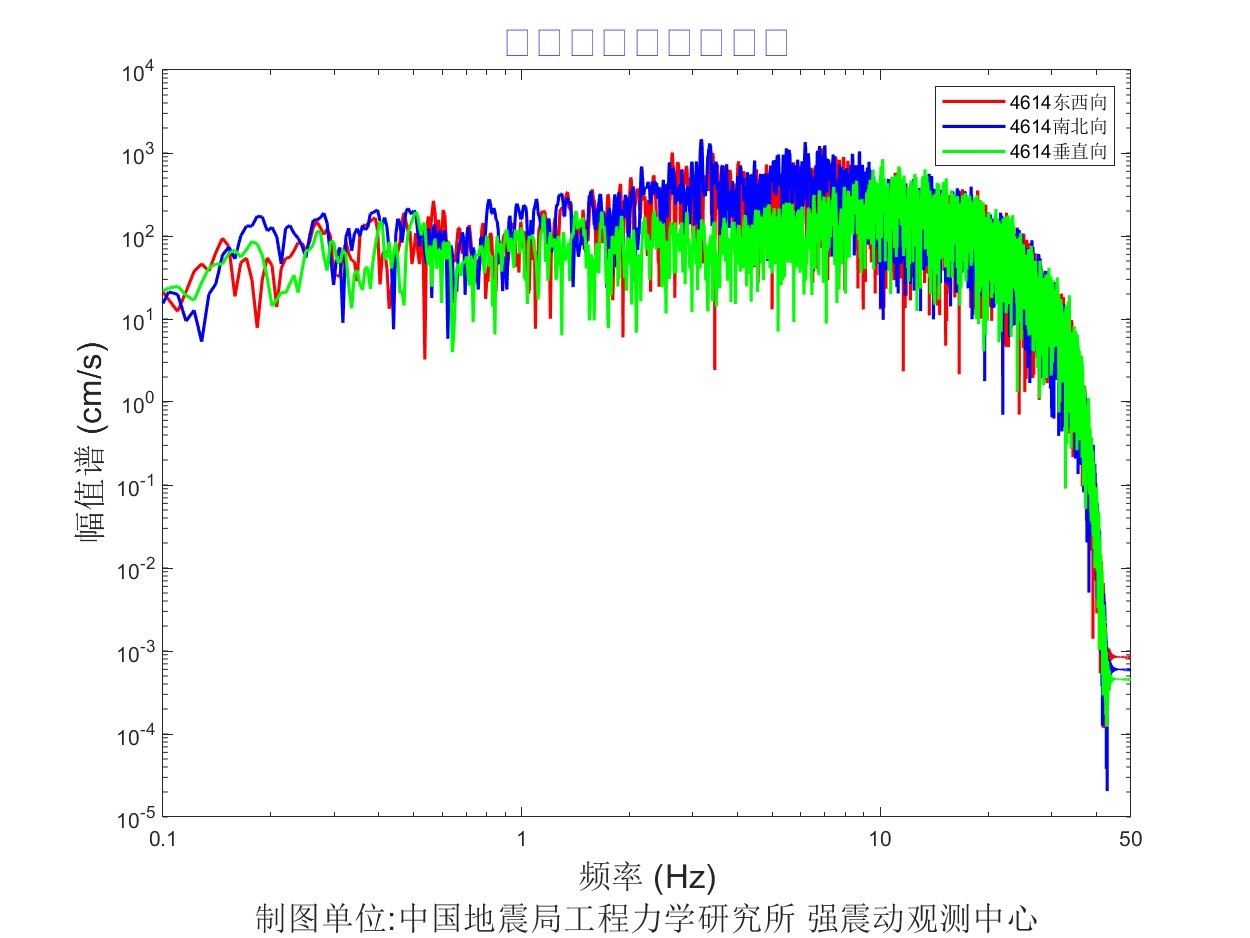 儀器地震烈度分布圖見圖1,地震峰值加速度分布圖見圖2,地震峰值速度分布圖見圖3,地震加速度反應(yīng)譜(T=0.3s、T=1.0s、T=3.0s)分布圖見圖4、圖5、圖6。4614臺強震動記錄見圖7,4614臺加速度反應(yīng)譜見圖8,4614臺傅里葉幅值譜見圖9。