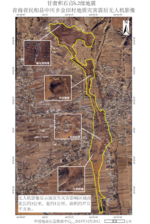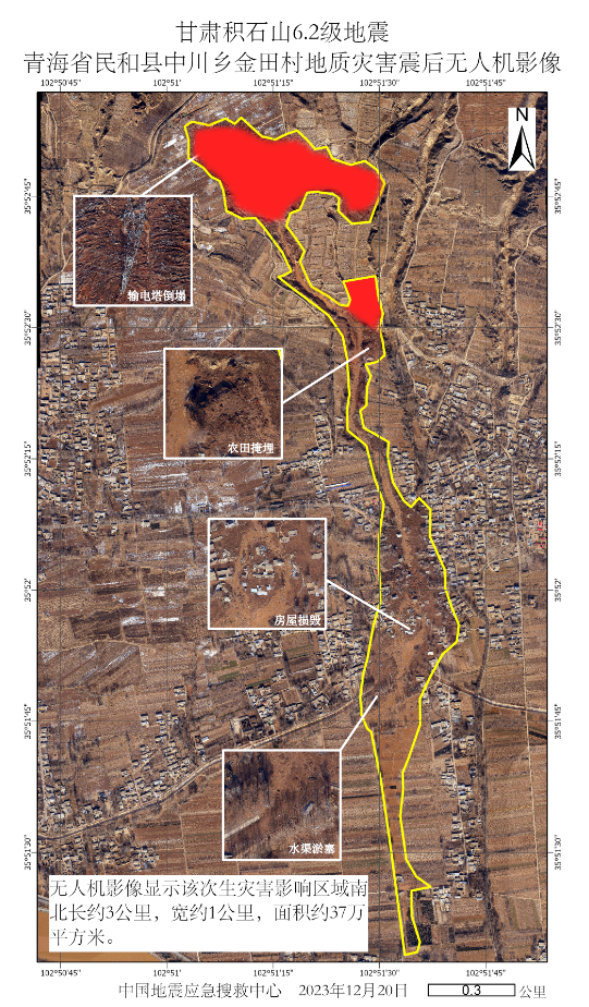 發布時間: 2023-12-25 點擊數量:55822023年12月18日23時59分,甘肅省臨夏積石山縣發生6.2級地震。此次地震已造成部分房屋損毀甚至倒塌,并由此造成人員傷亡。除房屋倒塌外,此次地震在青海省海東市民和縣中川鄉金田村和草灘村引發了被稱之為“砂涌”的特殊現象,區域內部分房屋被厚達數米的流滑土壤掩埋(圖1)。