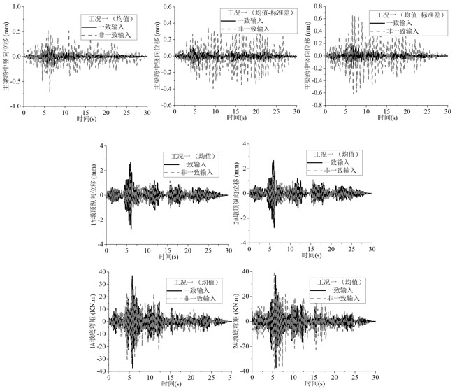 地震動(dòng)的頻域非平穩(wěn)性可通過(guò)累積穿零量隨時(shí)間變化進(jìn)行描述,在傳統(tǒng)譜表達(dá)合成地震動(dòng)的基礎(chǔ)上分別引入相位差譜和累積穿零量對(duì)合成結(jié)果進(jìn)行強(qiáng)度、頻域非平穩(wěn)化。利用CESMD數(shù)據(jù)庫(kù)中豐富的地震動(dòng)記錄擬合出相位差譜隨震級(jí)、震中距變化模型,以及累積穿零量隨時(shí)間變化的經(jīng)驗(yàn)?zāi)P停俅肟臻g相干函數(shù)拓展為多點(diǎn)非平穩(wěn)地震動(dòng),改進(jìn)后方法流程如圖1。由圖2可知,所模擬的地震動(dòng)時(shí)程不僅具有強(qiáng)度及頻域非平穩(wěn)性,同時(shí)體現(xiàn)了空間多點(diǎn)的相干性。將上述合成的地震動(dòng)通過(guò)一大跨橋梁進(jìn)行多點(diǎn)地震動(dòng)輸入驗(yàn)證,討論了一致和非一致輸入下的結(jié)構(gòu)響應(yīng)差異。